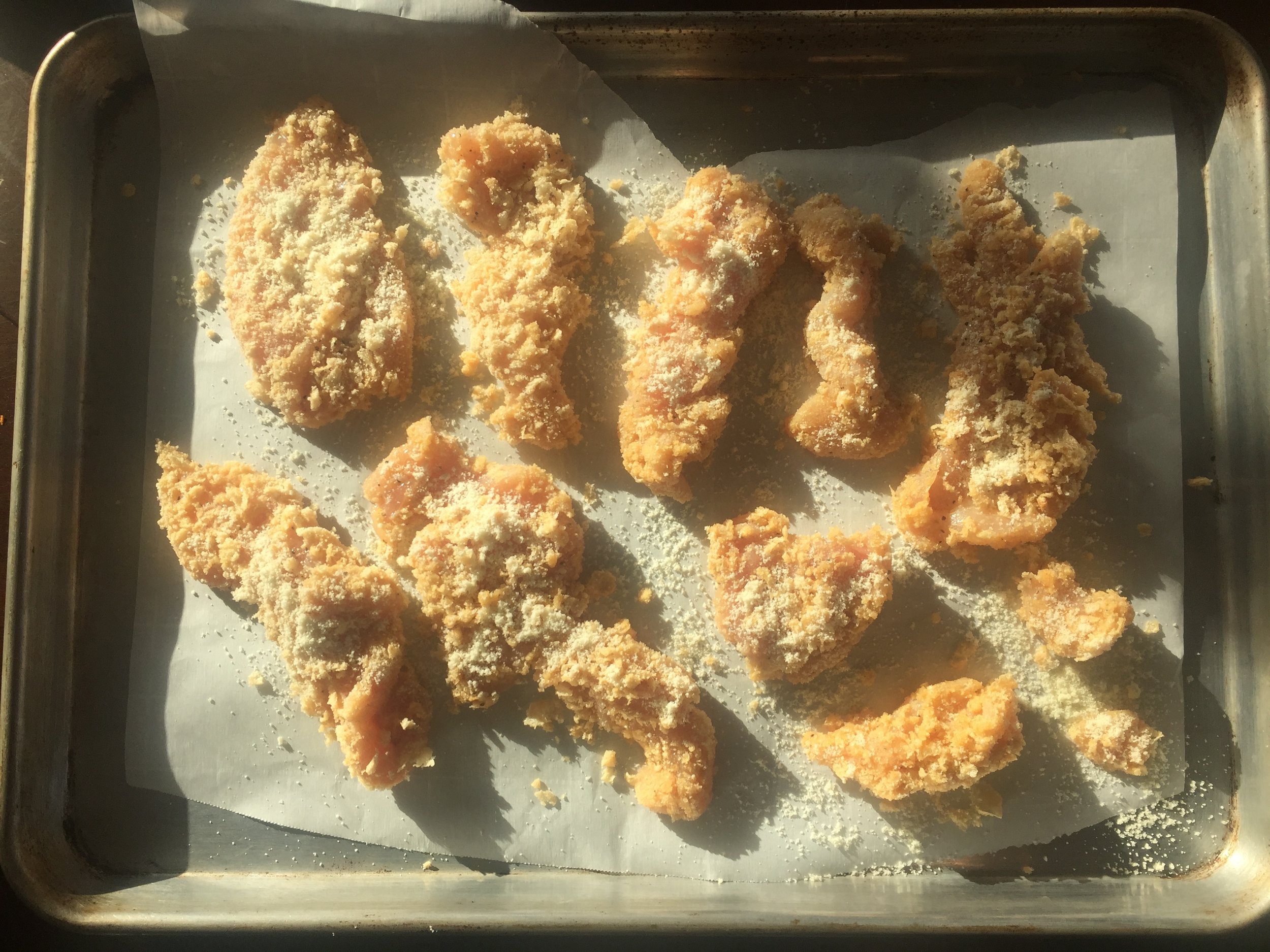 Lay all the tenders on a baking sheet. If you have parchment paper this works really well to avoid the breading sticking to the pan.